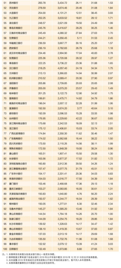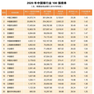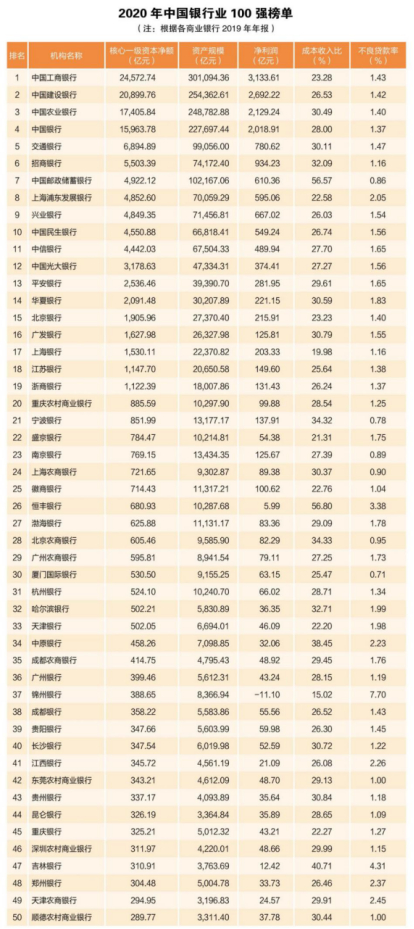 据悉,该榜单遵循简单、客观、专业原则,参考巴塞尔协议Ⅲ和监管机构相关要求,按核心一级资本净额排序,并附加资产规模、净利润、成本收入比、不良贷款率等指标作为参考。该榜单已经连续五年发布,本年度上榜100家银行资产总和占商业银行总资产的90.5%,创造了商业银行95.0%的净利润。