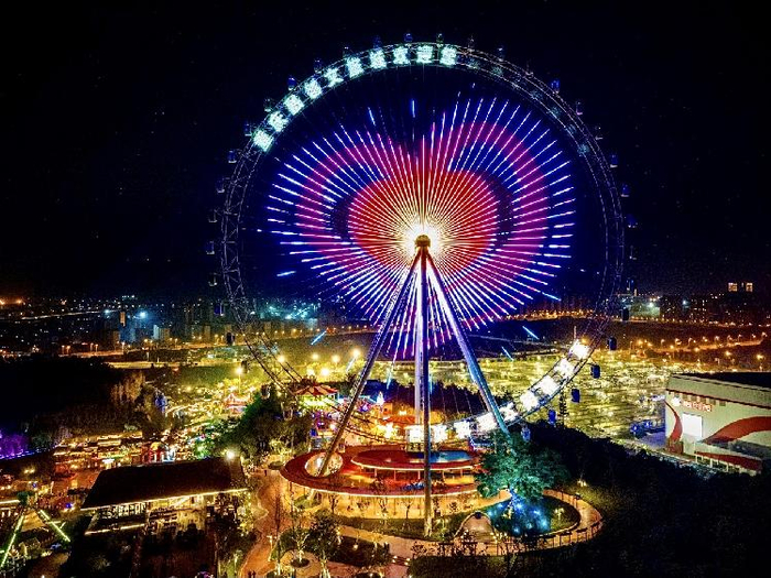 繁华之上,换个角度看重庆,体验别样浪漫。作为融创渝乐小镇的地标建筑,“山城之光”摩天轮受到许多游客的喜爱。摩天轮架设在约30米高的山体上,总高度148m,直径约100m,相当于约30多层楼高。游客能够俯瞰到西永全貌,领略科技之城的璀璨风光。摩天轮内,游客可以通过轿厢提示,打开手机蓝牙进行连接,瞬间可以自主选择喜欢的歌曲播放。游客还能自主打开轿厢里的彩灯带与射灯,欢乐气氛也随着摩天轮转动升高而升温。部分轿厢还设置了透明地板,按下开关,地板就变得360°全透明,增添不少惊险刺激体验。