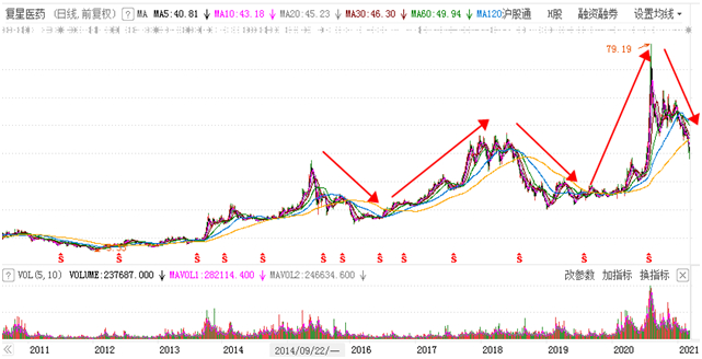 可是好景不长,就在大家以为复星要崛起的时候,调整又来了,2020年8月以来,从79元/股下跌到现在的38.8元/股,看均线走势,似乎还要往下跌。