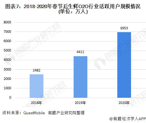 近年来,随着生鲜商品从菜场向商超、电商渠道转移,本地生活O2O的快速发展,生鲜O2O用户规模不断增长,2020年新冠疫情爆发,人们积极响应居家隔离防疫措施,减少外出采购,生鲜O2O迎来用户规模的快速增长,生鲜O2O平台用户规模大增,根据QuestMobile数据显示,春节复工后30天,生鲜O2O行业活跃用户规模达近7000万人。