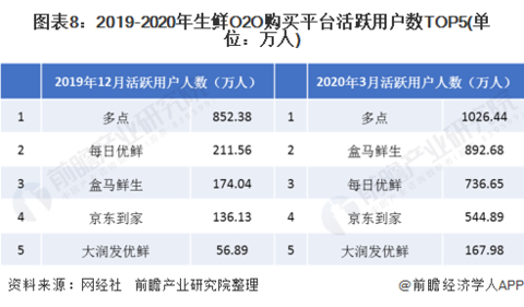 2019-2020年生鲜O2O购买平台活跃用户数TOP5