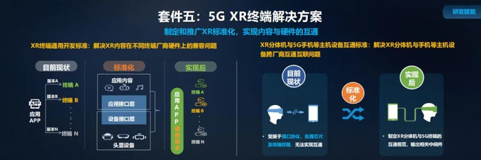 第五个组件是 5G XR 终端解决方案。当前 XR 产业发展中仍有成熟度不足、终端体验差、内容应用偏少等问题,并且 XR 生态碎片化问题严重阻碍行业的快速发展。中国移动希望形成行业互通标准 GSXR,解决开发平台与硬件厂商复杂的交叉关系,加速内容与应用在各类硬件产品包括 VR 一体机和 VR 分体机的适配,促进 5G+XR 的发展。