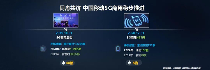 2020 年新冠疫情全球蔓延,生产和生活受到冲击也带来很多改变,应该说这是不平凡的一年,也是在这一年的不断努力之下,中国移动 5G 终端交出了一份还算不错的答卷,中国移动网内 5G 手机销量已超过 1.1 亿部,推出 5G 手机款型 162 款。能取得这样的成绩,是终端产业链各方同舟共济、夜以继日努力的结果。
