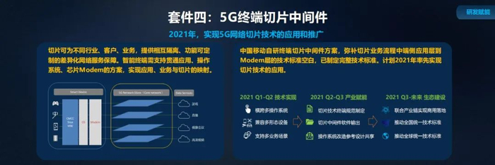 第四个套件:5G 切片能力是 5G 通信技术中最重要的新功能之一,考虑到切片与操作系统、基础芯片、业务模式的紧密关联程度,中国移动将在推出一套横跨多操作系统、兼容多形态设备、支持多业务场景的解决方案,建立完整的业务链条,希望在 2021 年在全球率先实现切片服务商用落地。
