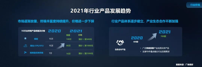 2020 年,5G 行业终端产品市场逐步放量,终端丰富度持续提升,模组、数据接入终端和视频监控终端等典型 5G 行业终端产品实现规模上量,预计 2021 年 5G 行业终端销量将突破百万。同时,行业终端价格需要进一步下降,模组降至 500 元左右,CPE、网关类降至 1000 元左右,视频监控类降至 2500 元左右。