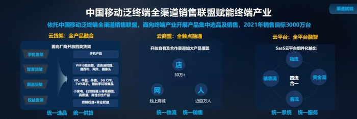第二是构筑“云商盟”,通过超 30 万家移动销售网点、主流电商,近百万名装维人员、网格经理、企微客户经理和社交营销推手,通过“到店”、“到网”、“到人”的全触点融通,实现统一物流、统一销售,为联盟产品提供强大的渠道销售能力。