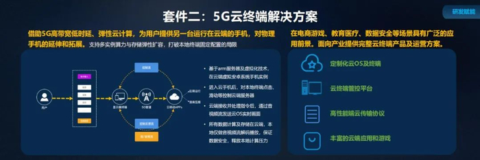 第二个套件:借助 5G 的高带宽低时延,结合弹性云计算技术,中国移动推出了 5G 云手机产品。云手机支持多实例、无限算力、海量存储等,打破了本地终端性能和功能的局限;同时云手机也变革了传统业务的交互逻辑,本地终端与服务器间通过传输音视频流、控制指令流等进行协同,实现操作系统和硬件的解耦,将带来更多创新的功能体验。5G 云终端解决方案以云手机技术为核心,围绕家庭终端、个人终端等带屏设备进行能力扩展,打造“端+云+业务+内容”四位一体的业务解决方案。