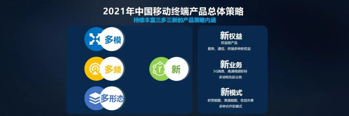 中国移动提出面向 2021 年的产品策略是“三多三新”。“三多三新”是指多模、多频、多形态,新权益、新业务、新模式。