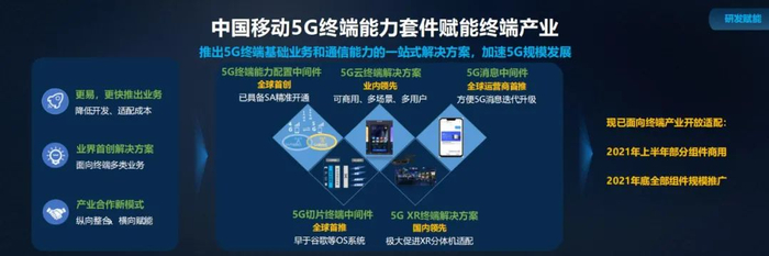 中国移动 2021 年增加了更多的合作模式,其中一项就是通过研发赋能,使产业更快捷的推出新业务、降低开发和适配的成本。在此,中国移动正式向产业链宣布推出首批“中国移动终端能力 5 套件”包括全球首创 5G 终端能力配置中间件、5G 云终端解决方案、5G 终端切片中间件、5G 消息中间件、以及 5G GSXR 终端解决方案。现已面向终端产业开放适配,2021 年上半年部分组件将实现商用。
