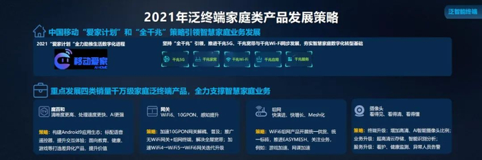 2021 年中国移动将基于“爱家计划”和“全千兆”引领策略,助力家庭数字化转型,发展泛终端家庭类产品。重点发展刚才提到的四类千万级的产品。