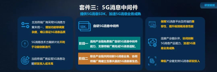 第三个套件:中国移动 5G 消息中间件能力是对传统短信业务的全面升级:个人消息不再局限于收发纯文本类型消息,还支持如图片、视频、位置等多媒体类型消息;另一方面,5G 消息实现了“消息即服务”能力,用户可在消息窗口互动,直观便捷地使用缴费充值、票务订购、物流查询等服务。