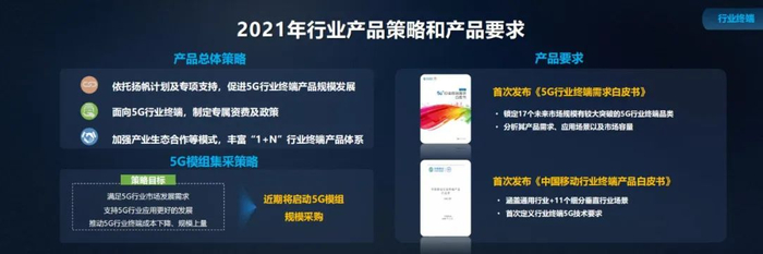 考虑到垂直行业的特点,比如手机大家都知道怎么用如何用,但是行业终端谁需要、需要什么、终端怎么用,都需要根据不同的细分领域进行明确,因此,中国移动在产品白皮书发布的同时也对需求进行明确。发布 2021 年中国移动《5G 行业终端需求白皮书》和《行业终端产品白皮书》。《5G 行业终端需求白皮书》锁定了多个未来市场规模有较大突破的 5G 行业终端品类,充分分析产品需求、应用场景以及市场容量,将需求导入终端产业;《行业终端产品白皮书》是将通用行业终端技术要求明确后,又针对 11 个垂直行业首次定义了更详细的技术要求。