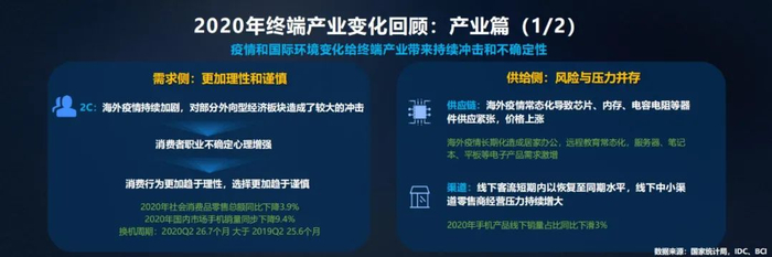 我们也看到 2020 年的疫情和国际环境变化给产业带来了冲击和更多的不确定性,风险与压力依然存在。需求侧更趋理性和实用,数据显示消费者手机换机周期已经将近 27 个月。供给侧上游供应链看,芯片、内存、电容电阻等器件供应紧张,缺货、涨价已经成了终端产业的热词。销售渠道上线上销售触点越来越多,线下门店客流不断缩减,带来对中小零售店的拓展压力,包括更多形态全场景服务,终端合作渠道也在不断转型和变化。