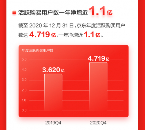京东集团最新发布的2020年第四季度和全年业绩显示,2020年第四季度,京东集团净收入为2,243亿元人民币,同比增长31.4%,2020年全年净收入为7,458亿元人民币。活跃购买用户数的增长更为亮眼——2020年第四季度,京东集团的年度活跃购买用户数单季净增超过3000万,创造了上市来最高增幅;截至2020年12月31日,京东年度活跃购买用户数达到4.719亿,一年净增近1.1亿。