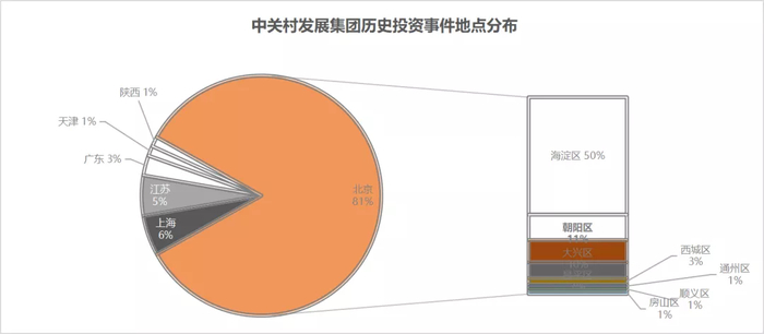 从中关村发展集团的名字和介绍就能看出其主要围绕北京市尤其是海淀区的项目展开投资。IT 桔子数据显示,当前有公开资料的投资项目中几乎所谓项目的注册地点在北京市,其中又有一半的项目注册地点在海淀区,可见中关村发展集团的投资与名字高度重合。