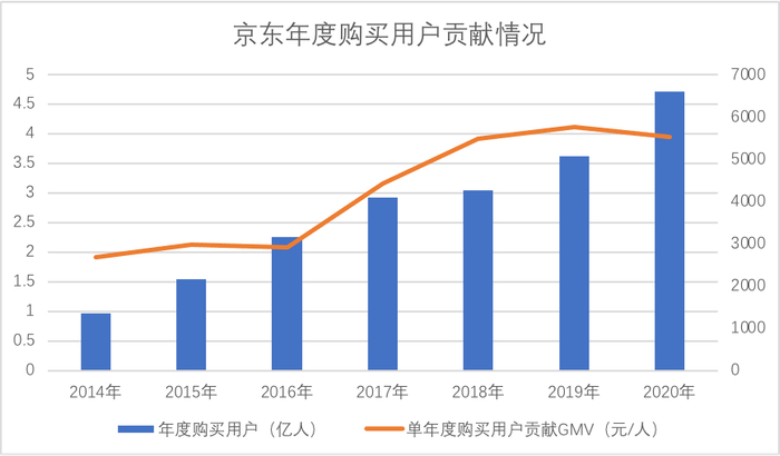 在相当一段时间里,京东年度购买用户都弱于GMV的增长,如2018年年度购买用户较上年仅增加1200多万,但GMV却增长30%有余。彼时渠道下沉,向下沉市场要用户几乎成为行业一种共识,京东在此反应较慢,挖掘原有客户群的购物潜力成为当时拉动GMV的主要手段。