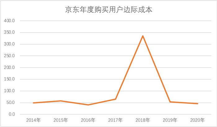 我们用市场费用的年度增加值,除以年度购买用户的净增量,大致测算京东在年度购买用户方面的获客边际成本,见下图