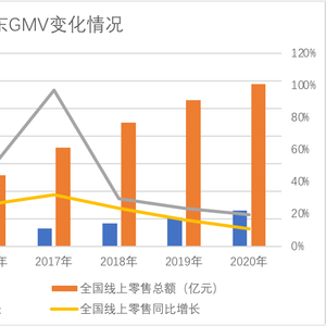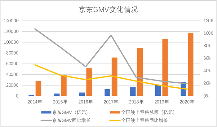 我们先整理了近年京东GMV与全国线上零售总额的变化情况,见下图