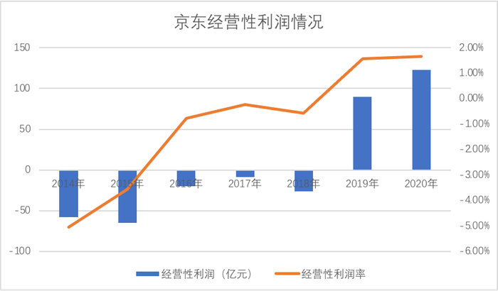我们又整理了多年来京东的经营性利润和经营利润率情况,见下图