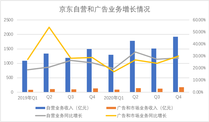 我们整理了近两年以来京东广告和自营的业务的增长情况,见下图