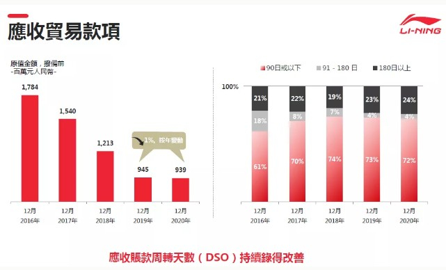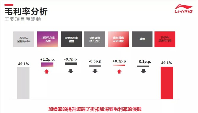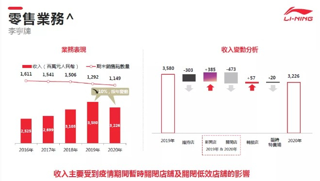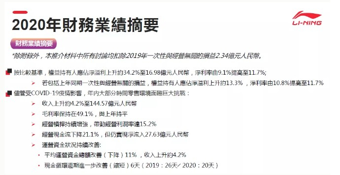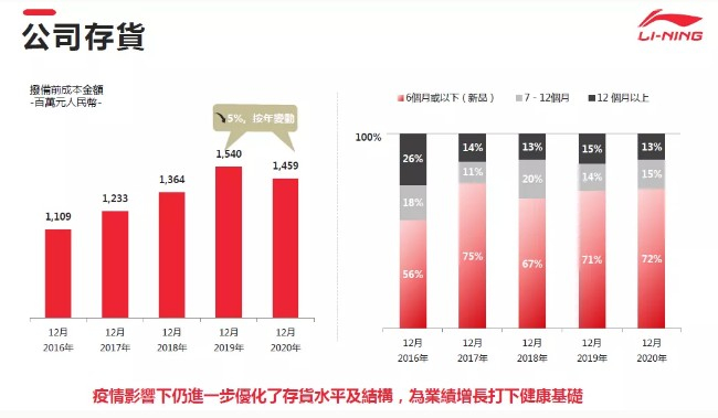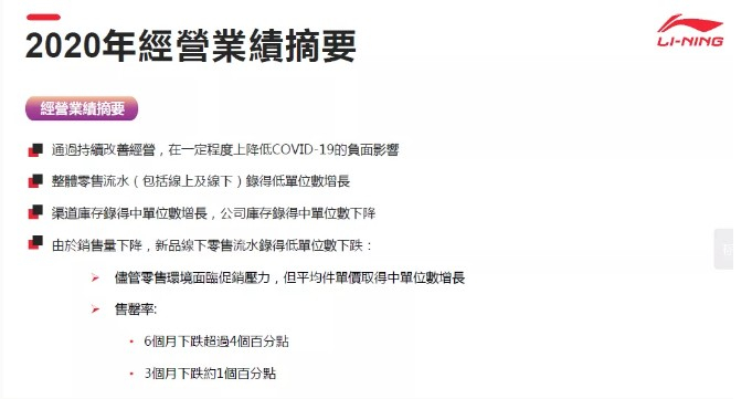 在销售表现方面,确定五大核心品类的全平台零售流水由2020上半年的下跌11%恢复至全年度的正增长。2020下半年度的零售流水明显稳步回升,其中运动时尚品类在疫情下表现表现出较强的韧性,全年度零售流水增长23%。跑步及训练品类由于较强的功能属性,受疫情影响较大,但与2020上半年相比,2020下半年仍有明显的恢复趋势,疫情发展开始明朗,内需市场陆续恢复。我们对李宁品牌的长期发展是充满了信心。