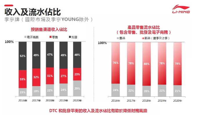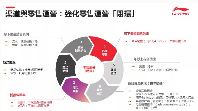 渠道策略及表现:公司平衡渠道策略得到凸显,主要是在李宁主品牌的批发和直销渠道之间,公司平衡了渠道和财务、运营资金和盈亏之间的风险。