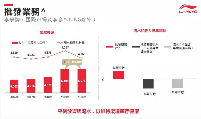 批发业务收入(不包括羽毛球和足球的专业批发商)同比减少低单位数(主要因为老货收入较低),加上新产品的收入,2020年总体批发收入基本持平。