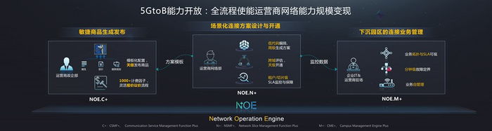 通过NOE.C+( Communication Service Management Function Plus,CSMF+)组件模板化配置能力,很好地匹配中国移动5G专网BAF(Basic- Advanced- Flexible)模型落地,通过一客一策一价、融合产商品订购诉求,实现5G专网业务商品天级上架发布,实现5GtoB业务的敏捷运营、灵活扩展和迭代创新。