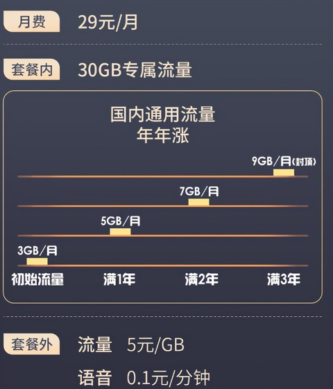 别着急,如果这样肯定不可能吸引超过10万用户和100%好评度。该套餐对老用户很有好处,因为通用流量它自己可以“成长”,第一年每月赠送3GB流量,第二年赠送5GB流量,第三年赠送7GB流量,第三年赠送9GB流量,也就是说你用了3年,29元月租,可以拿到9GB通用流量,这套餐就非常“香”了