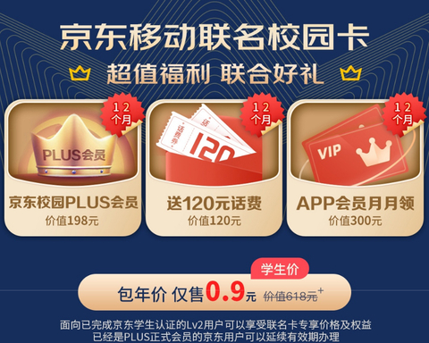 你以为只有这些吗?其实还不止呢!该套餐针对学生群体推出的京东移动联名校园卡,虽然只有0.9元,但是却可享受很多权益,比如12个月京东校园PLUS会员,这个如果按照正常途径购买,就需要198元;12个月送120元话费;12个月APP会员,价值高达300元。它面向已完成京东学生认证的Lv2用户,可以享受专享价格和权益,已经是PLUS正式会员的京东用户,可以延续有效期办理。