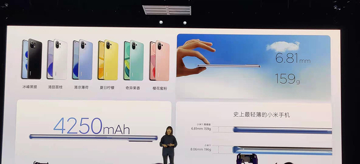 另外在机身三围控制方面,小米11青春版据称是小米史上最轻薄的手机,厚度仅为6.81mm,重量159g,在这个尺寸重量下,电池容量为4250mAh,有线充电功率为33W。