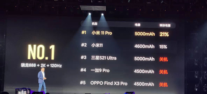 据称在小白测评5小时重度续航测试中,小米11 Pro的电量剩余为21%,位列2K 120Hz各厂商机型中第一名,甚至相比其他1080P骁龙888机型也有明显领先。