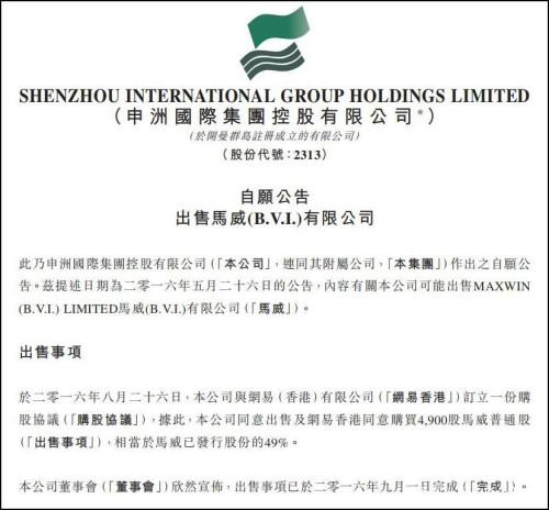 这一年的9月1日,申洲国际发布公告称,公司与网易香港签署股份购买协议,以7724.5万的价格向网易香港转让49%的马威股权。