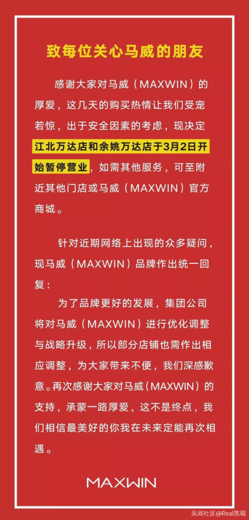 在2019年3月“致每位关心马威的朋友”的公开信中,浙江宁波江北、余姚两地的马威门店关停,被指是出于安全因素的考虑;对于马威这一品牌的处置,也被解释为是公司进行优化升级和战略调整。