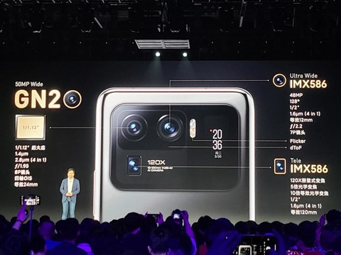 接着雷军又带来了小米11Ultra,这机器与小米11 Pro在屏幕,充电,快充等方面基本没区别,厚度更薄但重量更重。主要是摄像头全面提升,除了三星GN2超大底主摄外,还有两颗IMX586副摄与120倍数码变焦的潜望式镜头,以及一块用于自拍的副屏。