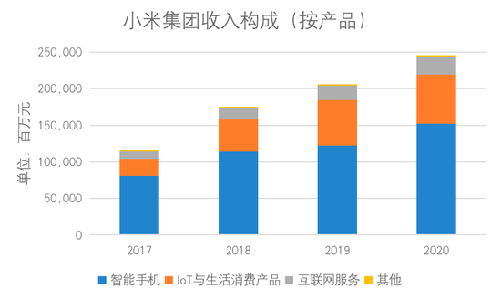 按产品种类划分的收入构成图清晰的显示出,2019年小米智能手机收入同比增速不大,但IoT与生活消费品有了较大增长,成为拉动小米业绩增长的主动力。2020年智能手机收入同比增长较多,这部分的增长在日后极有可能转化为再一次的IoT与生活消费品的爆发。