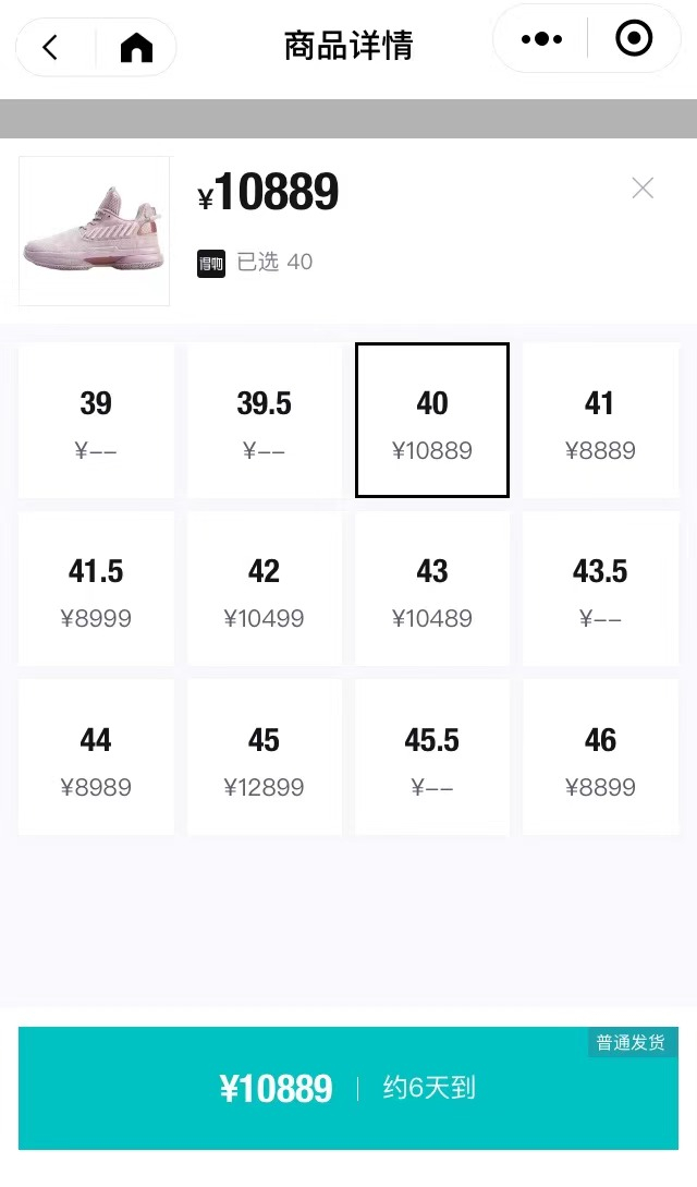 又如李宁韦德之道7 wow7 The Moment超越限量款,40码的售价为10889元,相比发售价1699元涨了近6.4倍。同时,这款鞋最近购买数据达271条,截至发稿时4小时前刚成交一笔44码的鞋,成交价为8989元。