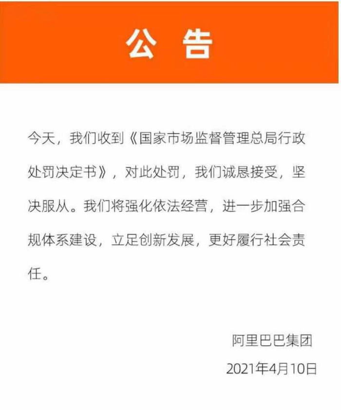 对此次处罚,阿里巴巴发布公告回应称,已经收到《国家市场监督管理总局行政处罚决定书》,“对此处罚,我们诚恳接受,坚决服从。我们将强化依法经营,进一步加强合规体系建设,立足创新发展,更好履行社会责任。”