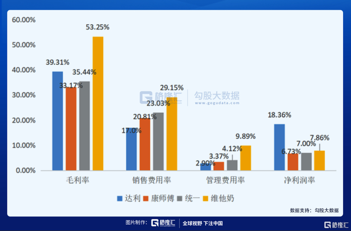 但从基本面来说,达利食品的基本面是比同行更扎实的。可以看到,达利拥有比竞争对手更好的控费能力,销售费用率比同行低3-10个点,管理费用率低1-7个点,从而拥有比竞争对手更高的净利润率。