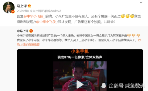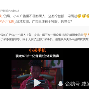 昨日,小米在某短视频网站投放了宣传视频,随后就有博主@马上评质疑视频内容,其称宣传片中是一个黑人主角,三女一男四位国人众星捧月为其演奏乐曲。