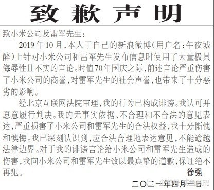 犹记得2019年国庆,网友@午夜城醉发文称“”、“雷军腐蚀军队”,结果被小米以诋毁小米及雷军名誉权等因素被告上法庭,去年法院宣判:@午夜城醉