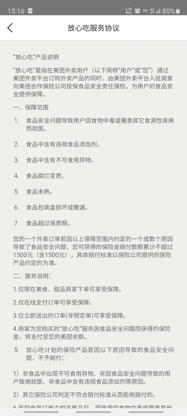“仅立即送出的订单(非预定单)可享受保障”“因食品安全获得的保险金支付至余额”“食物中毒应在订单送达后24小时内在二级以上公立医院就医,否则理赔申请要求将可能被拒绝”“当保险公司支付完毕理赔款项后,即视为当次争议已处理完毕,消费者承诺不再主张任何权利或二次赔偿”“食品中含有不可食用异物,按照已实际支付的食用订单中含有异物的该相关餐品的金额进行赔偿,最高赔付不超过1500元”等。