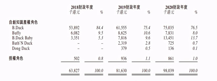 其中,B.Duck最为吸金,同期来自该角色的授权收入分别为5389.2万港元、6155.5万港元和7503.5万港元,分别占到同期角色授权业务收益的84.4%、75.4%和76.5%。而带上小黄鸭背后的家族,2020年授权收益达到9803.9万港元。