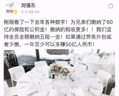 在2018年2月时,刘强东有发布了一则动态表示,京东过去一年给员工缴纳保险、公积金共60亿,公司坚持全员、全额缴纳五险一金。