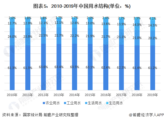 从需求结构看,农业用水一直是用水需求最大的产业,占比超过60%。其次是工业用水,需求占比在20%以上,第三用水需求是生活用水,最后为生态用水。