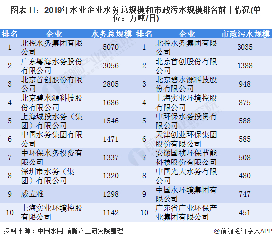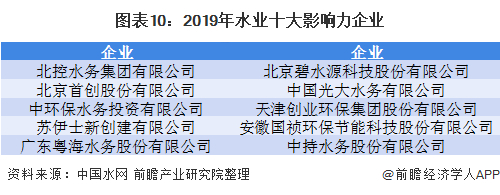根据企业的业绩以及他们在资本市场、稳健运营、企业社责任等方面的综合评价,中国水网评选出2019水业十大影响力企业为:北控水务集团有限公司、北京首创股份有限公司、中环保水务投资有限公司、苏伊士新创建有限公司、广东粤海水务股份有限公司、北京碧水源科技股份有限公司、中国光大水务有限公司、天津创业环保集团股份有限公司、安徽国祯环保节能科技股份有限公司、中持水务股份有限公司。