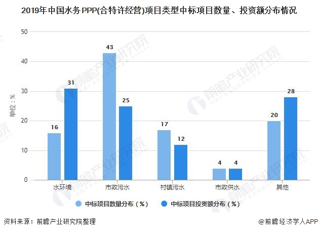 2019年,水务PPP(合特许经营)中标项目数量超过400个,投资额近3000亿。从项目数量分布上看,市政污水处理特许经营占主要部分,占比43%;从项目金额分布上看,水环境PPP占比最大,占比31%。