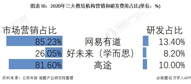 根据网易有道、好未来(学而思)和高途2020年年报的年报显示,市场营销费用占营收的比例远远大于研发费用,网易有道和高途的市场营销占比达到了80%以上,而研发占比仅为10%左右。