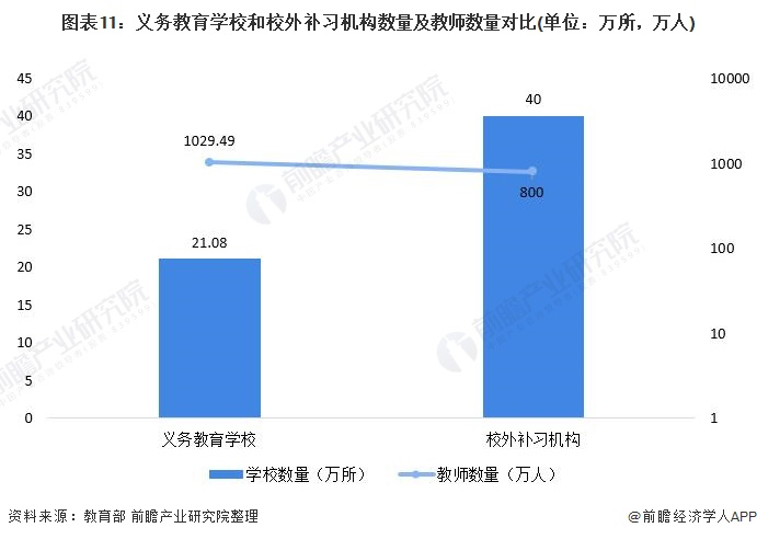 据了解,目前我国超过40万的校外培训机构有将近800万教师,而根据教育部公布的数据显示,我国义务教育阶段学校21.08万所,专任教师1029.49万人。