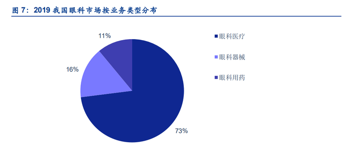 因此与眼科相关的医疗器械、眼科用药、医疗服务需求巨大,据机构金氪咨询统计2019我国的整体眼科市场规模接近2000亿元,其中眼科医疗市场占比总规模的73%。